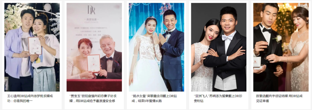 朗朗在吉娜生日当天告白,手持专属DR钻戒诉说“吉娜,你是我的DR”;苏炳添与初恋历经16年长跑,求婚时以DR钻戒许下婚约;张效诚向吴敏霞求婚时,亦携DR钻戒道出“因为是你,所以我们”。