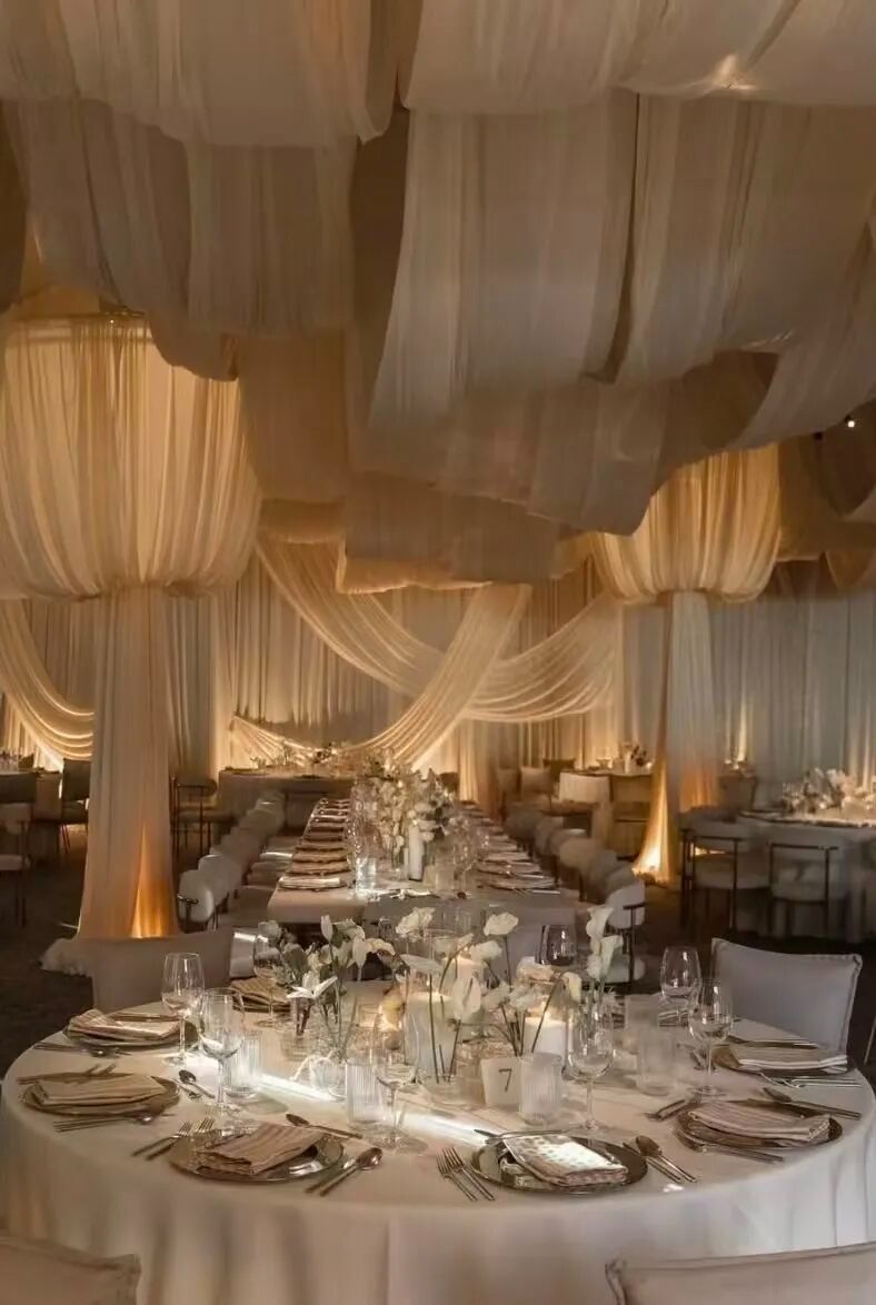 天花板成为主角。过去被忽视的“第五面墙”——天花板——正在迎来它的高光时刻。从垂坠的面料到流动的花艺,从镜面装置到灯光矩阵,天花板不再是背景板,而是空间叙事的核心篇章。