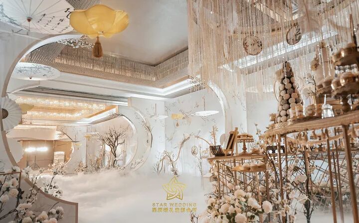 在白色的灯光基础上,点缀适量的亮色中式建筑,使婚礼极简又极有亮点。