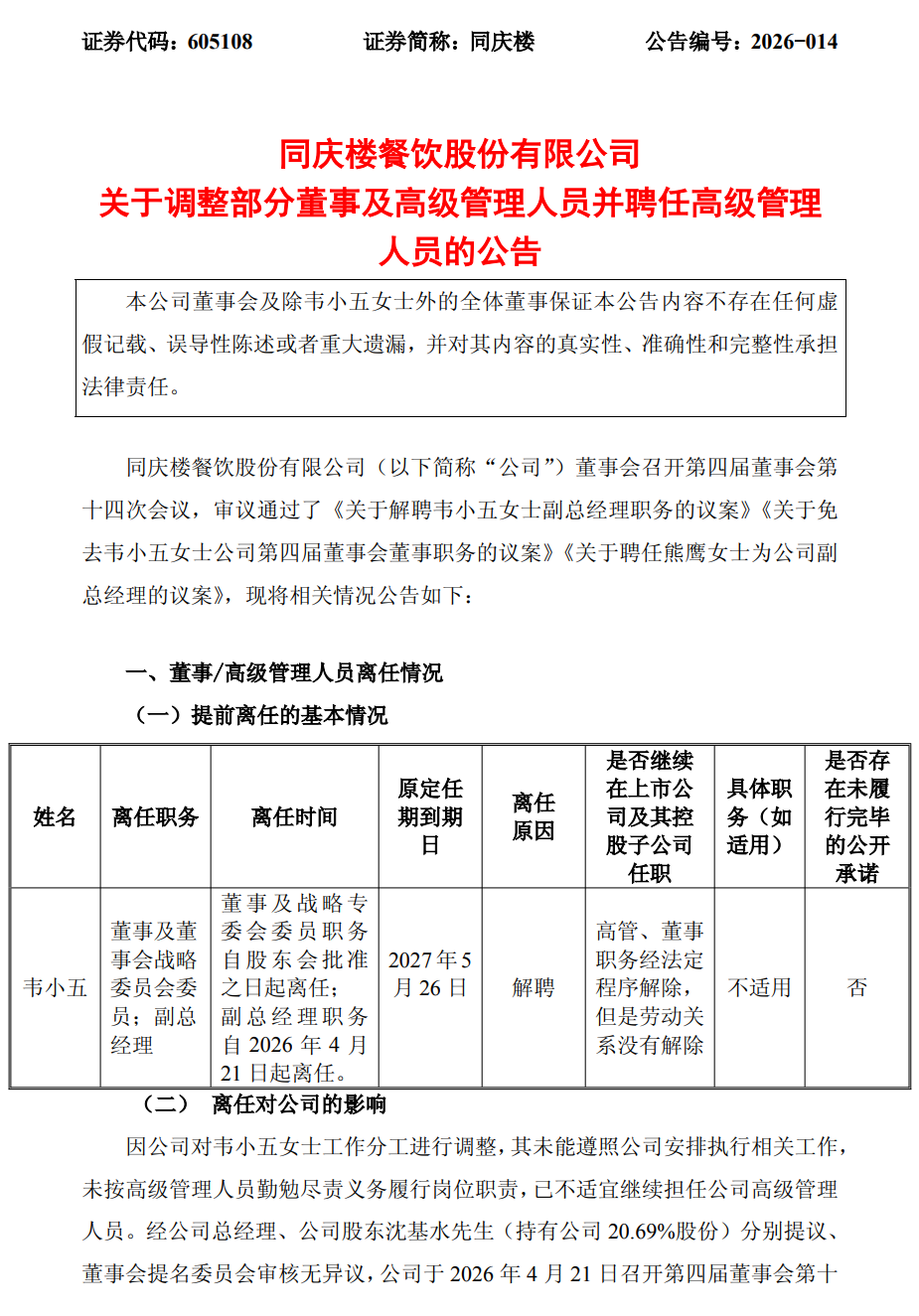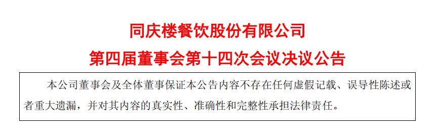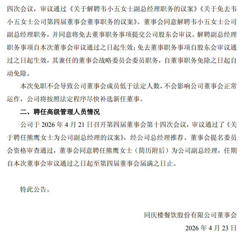 2026年4月23日,上交所主板上市公司同庆楼(605108.SH)发布了《关于调整部分董事及高级管理人员并聘任高级管理人员的公告》。