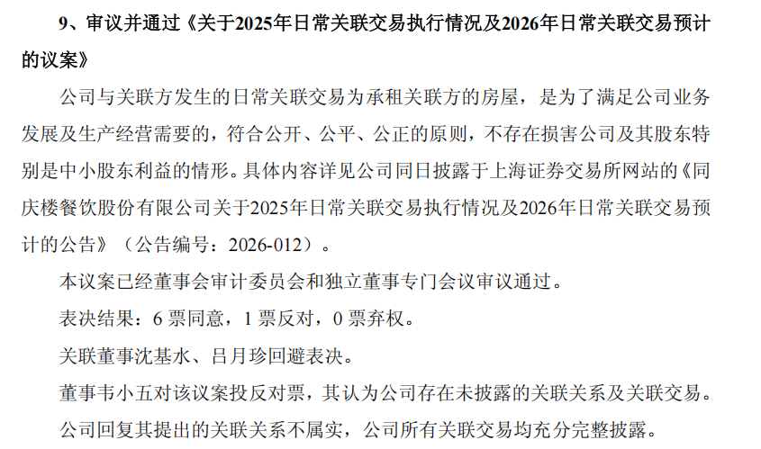 记者以投资者身份向同庆楼求证,同庆楼方面表示:“她所提及的关联交易内容,我们认为有些缺乏依据。公司在IPO阶段排队审核四五年,关联交易问题已核查得非常清楚。如果真有问题,那不仅涉及公司自身解释,会计师事务所审计报告也会有影响。”同庆楼方面补充称:“17项议案中她只对分红和年度股东会两项投了赞成票,其余均反对或弃权,坦白说,不排除其中含有一定个人情绪的因素。”