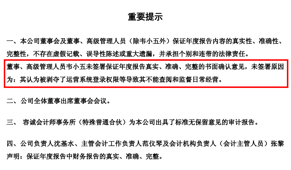 董事、高级管理人员韦小五未签署保证年度报告真实、准确、完整的书面确认意见,未签署原因为:其认为被剥夺了运营系统登录权限等导致其不能查阅和监督日常经营。