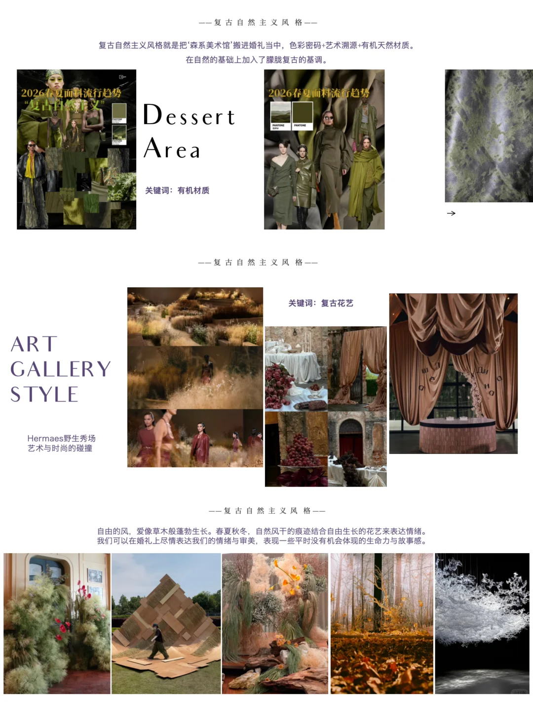 复古自然主义风格就是把“森系美术馆”搬进婚礼当中,色彩密码+艺术溯源+有机天然材质,在自然的基础上加入了朦胧复古的基调。