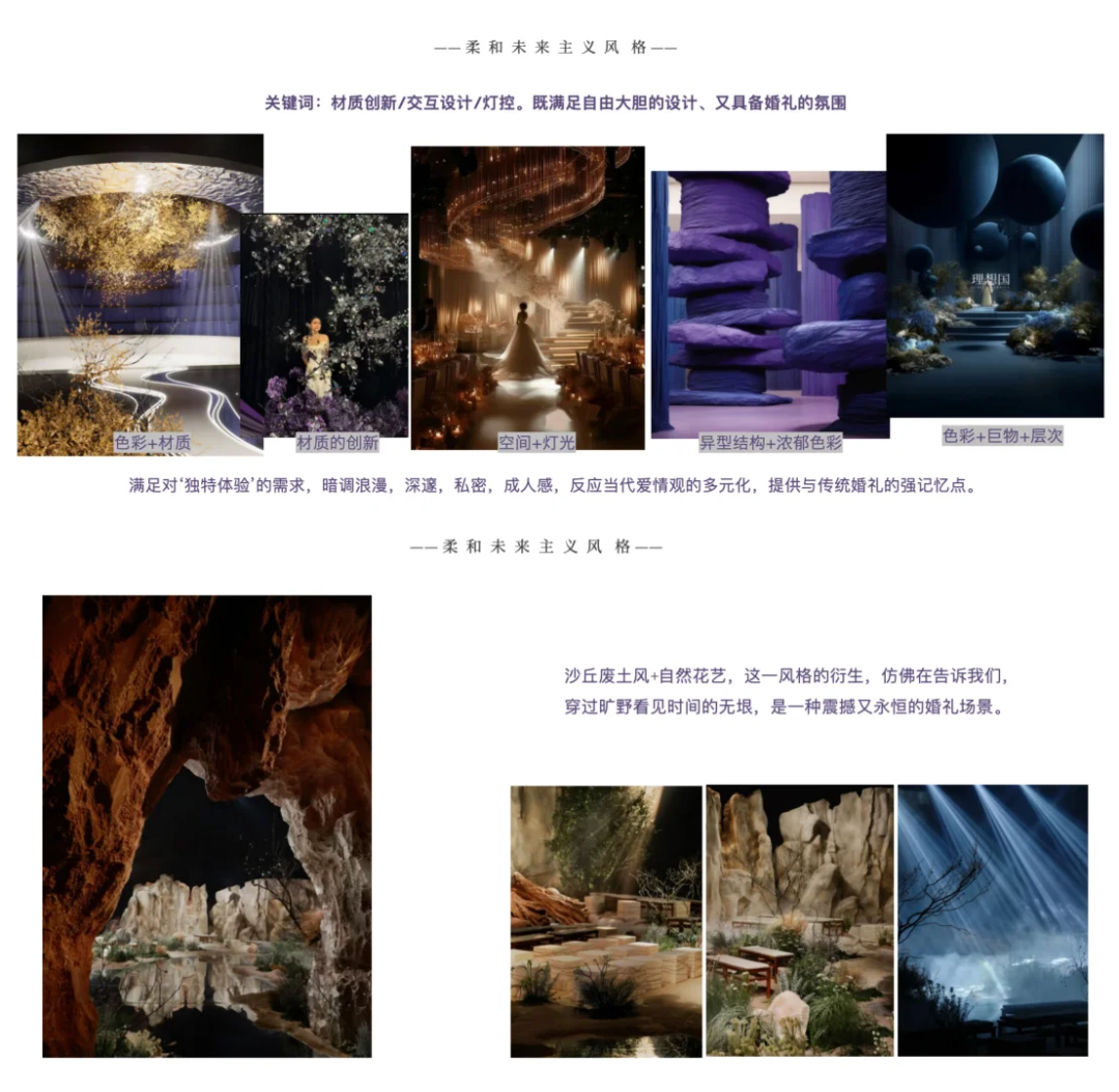 柔和未来主义风格满足对“独特体验”的需求,暗调浪漫,深邃,私密,成人感,反应当代爱情观的多元化,提供与传统婚礼的强记忆点。
