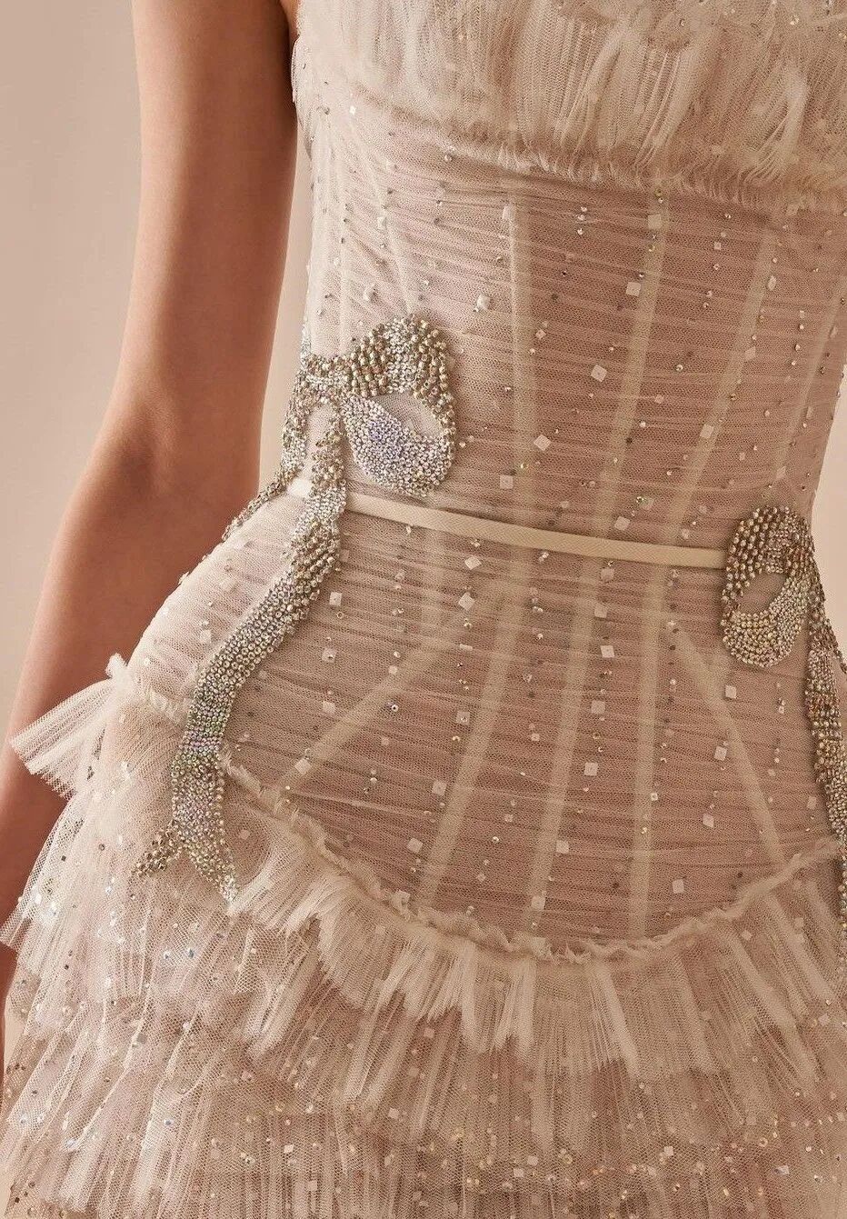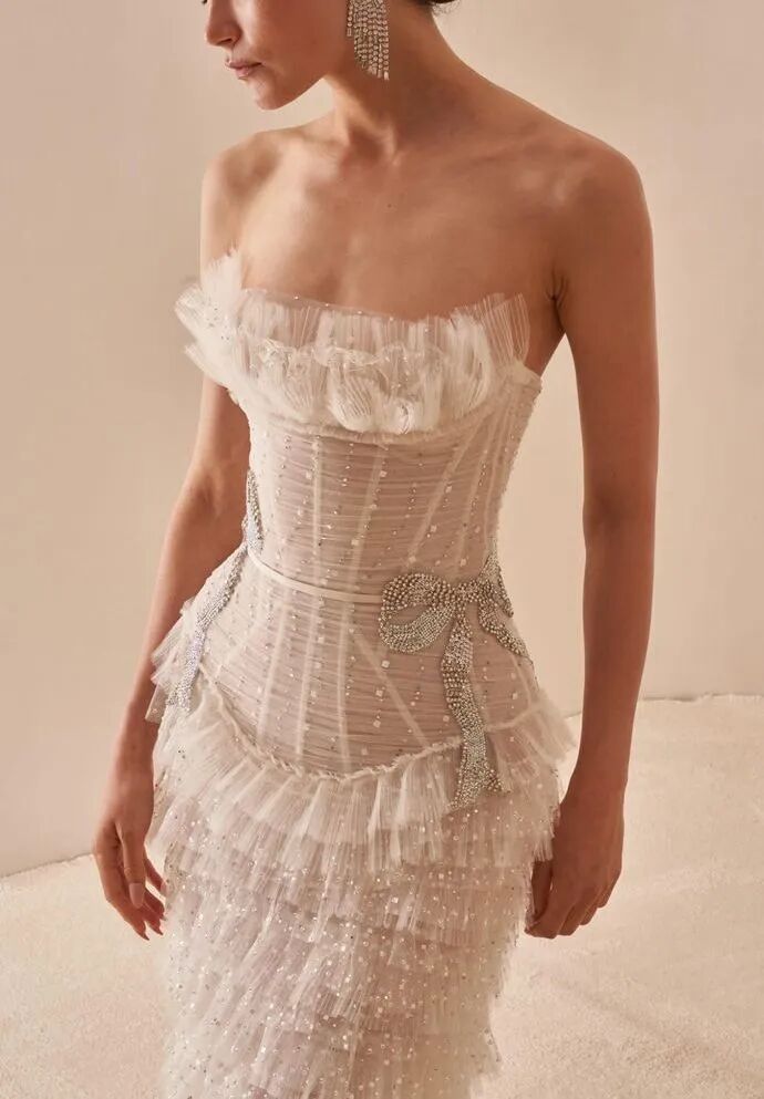 色彩也开始在这里涌现——柔和的香槟色、淡紫色和冰蓝色调正作为传统白色的替代色被引入。这一新的婚纱时尚时代鼓励个性表达和自我展现,为摄影师提供了通过面料和廓形捕捉质感、动感和情感的机会。