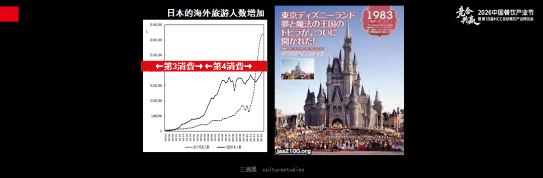 这张图左侧是日本人去海外旅行的人数,最初只有两三百万人出国旅游,1998年开始,每年出国旅行人数超过了1600万人。1983年,东京迪士尼乐园正式开业。